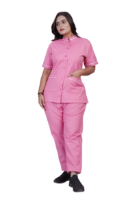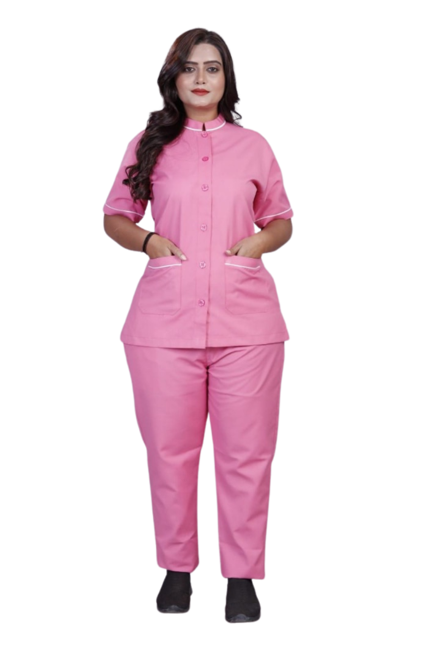 Nurse Uniform – 012 captures charm and confidence, the vibrant rose pink hue adds a refreshing touch to your professional wardrobe, while white piping details around the collar, sleeves, and pockets lend a clean, polished finish. Crafted with premium-quality fabric, it ensures easy movement, long-lasting shape retention, and breathable comfort throughout extended working hours. The band-style collar and front button-down design make it both functional and fashionable — ideal for nurses, paramedical staff, and hospital professionals who want to stand out with grace.